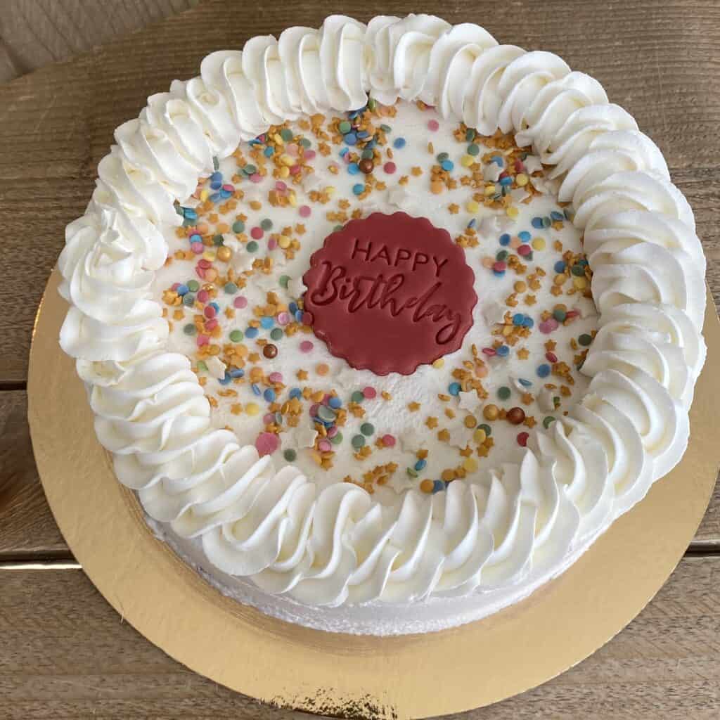 Vaste ontwerpen met witte crème, zoals te zien op de foto’s. Je kunt een persoonlijke tekst toevoegen en eventueel sprinkels of extra decoraties. De foto’s laten precies zien hoe deze taarten worden gemaakt bij onderstaande producten.
