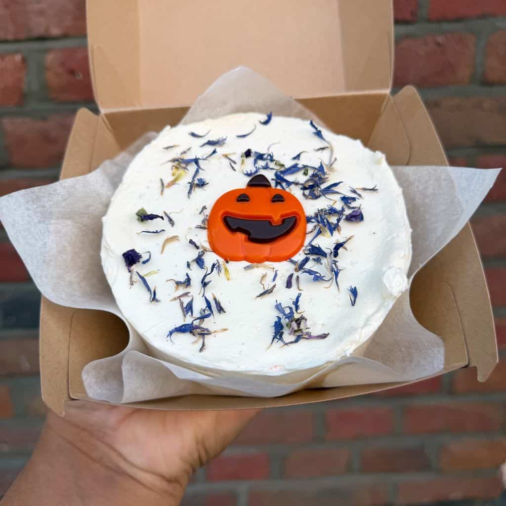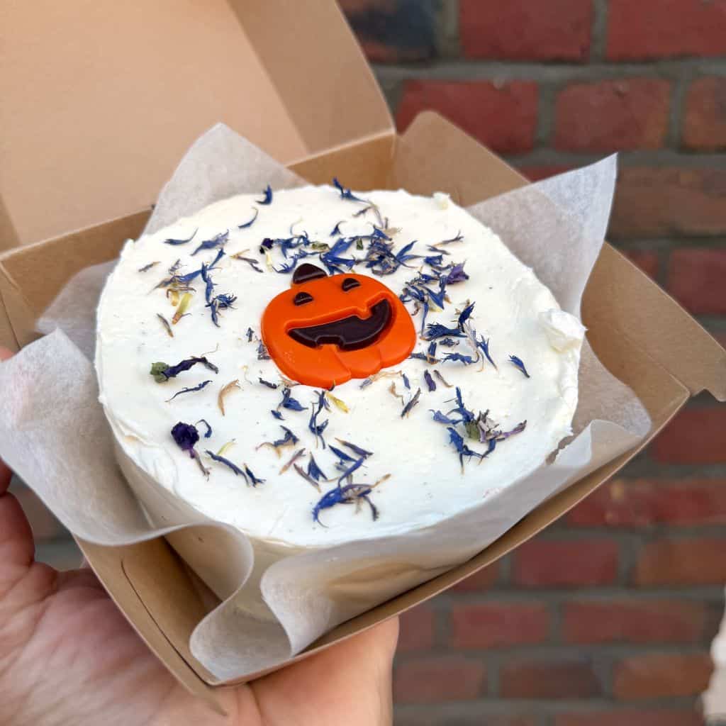 Dit is de vegan en glutenvrije Halloween Pumpkin bento cake die je online kan bestellen bij Amsterdam Cupcake Company. Deze vegan en glutenvrije Halloween Pumpkin cake wordt gedecoreerd zoals op de foto, in een smaak naar keuze.